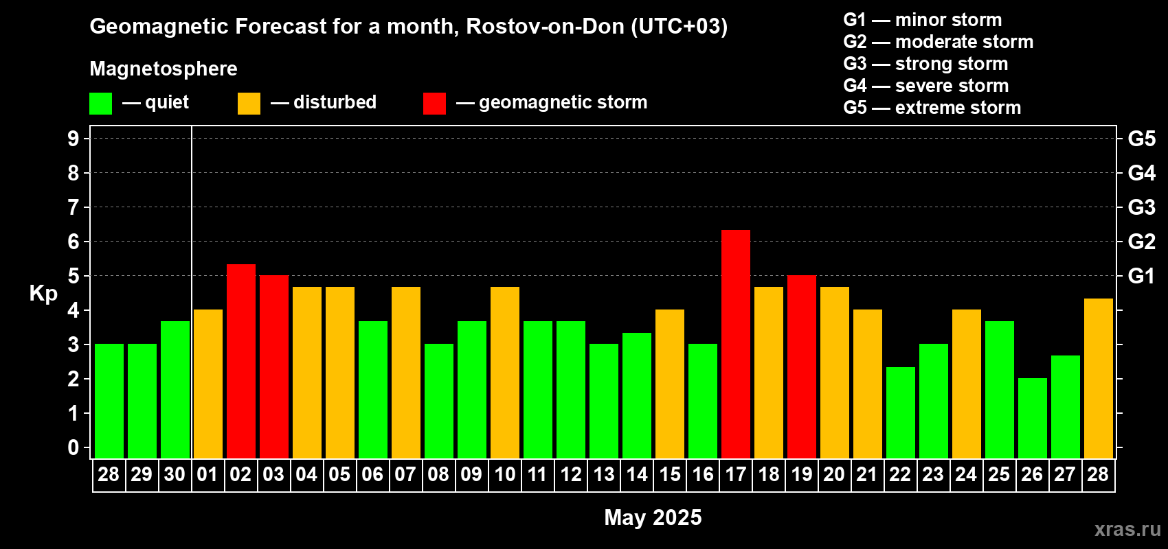 Geomagnetic storm forecast in Rostov-on-Don for Apr 28, 2025