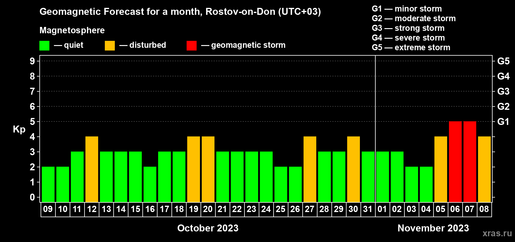 Geomagnetic storm forecast in Rostov-on-Don for Oct 09, 2023