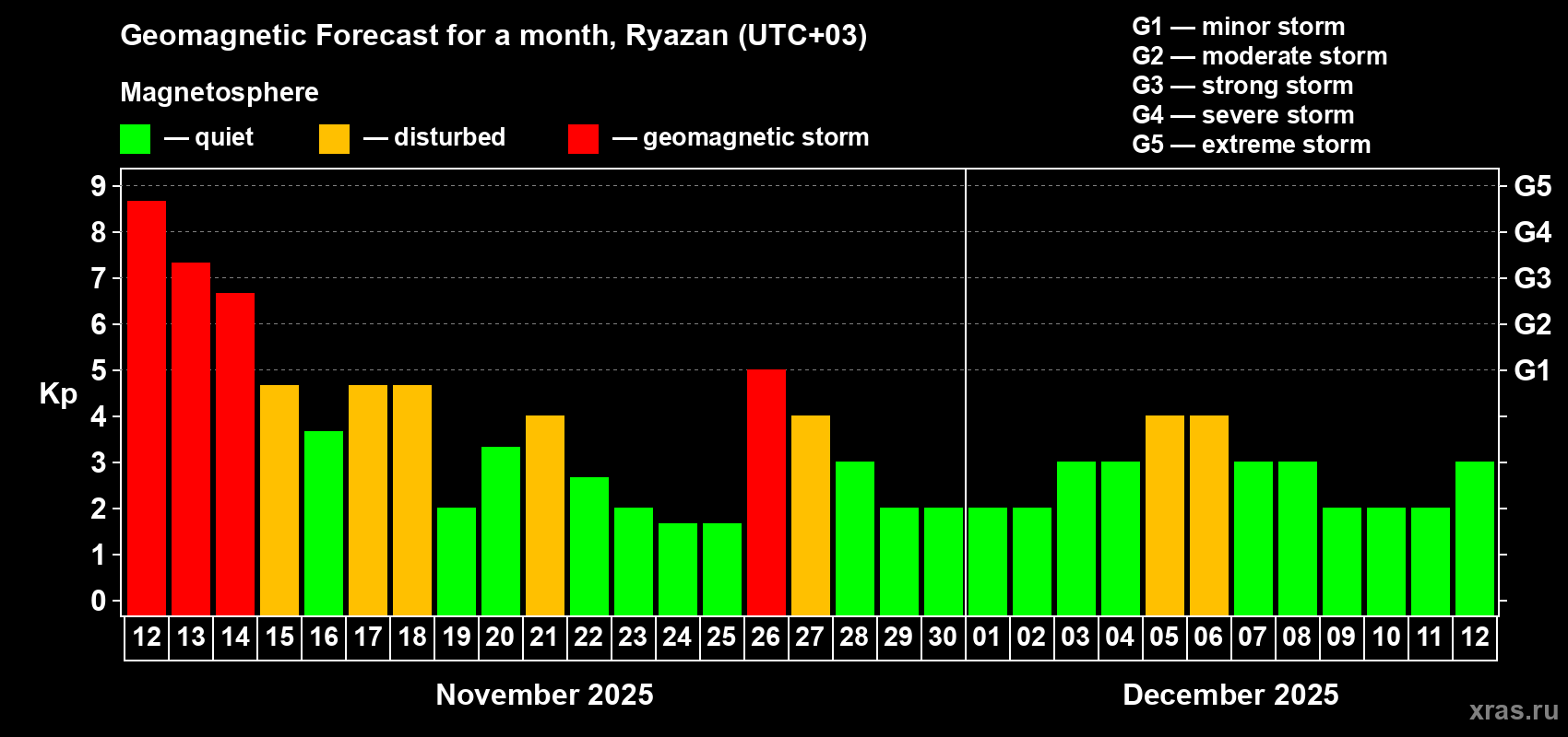 Geomagnetic storm forecast in Ryazan for Nov 12, 2025