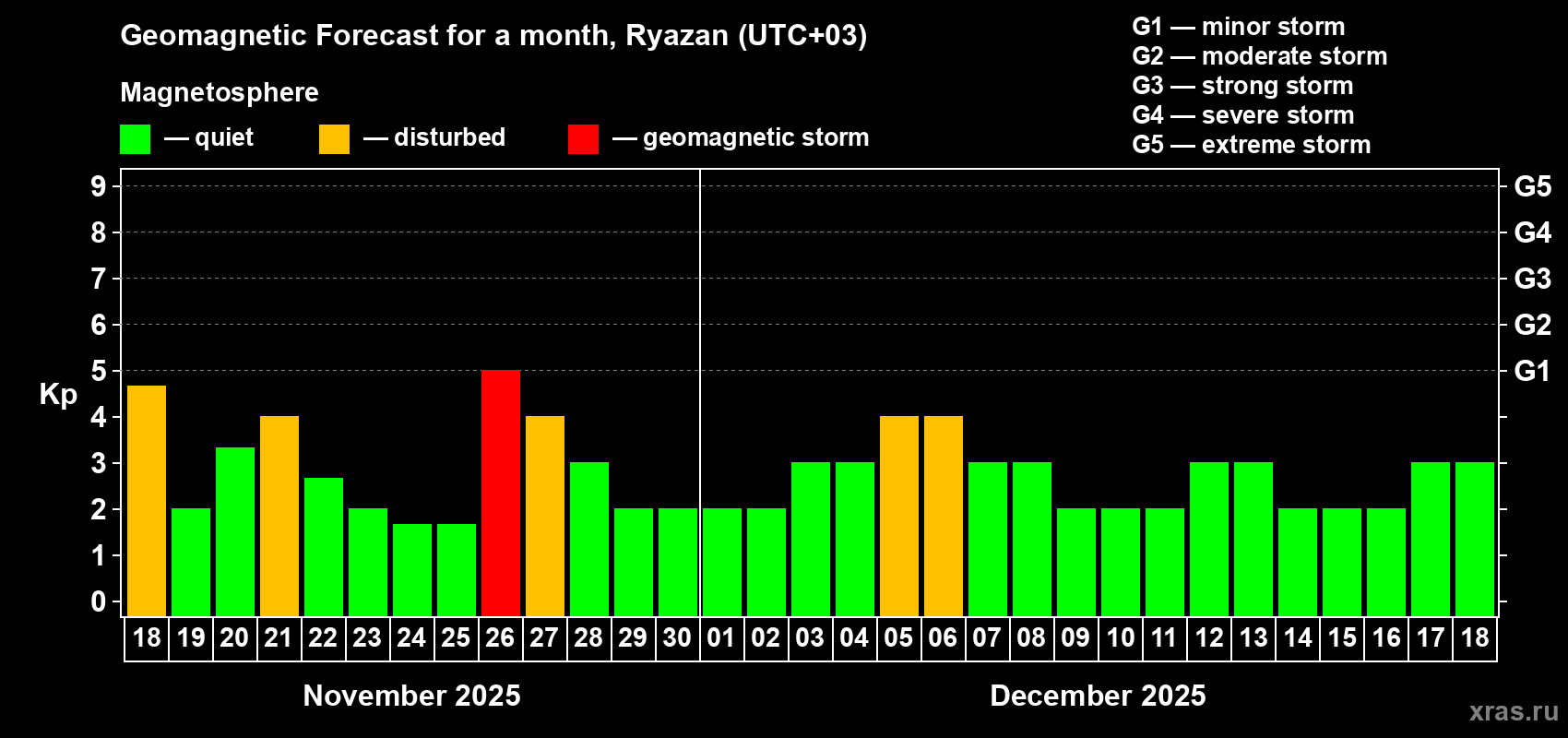 Geomagnetic storm forecast in Ryazan for Nov 18, 2025