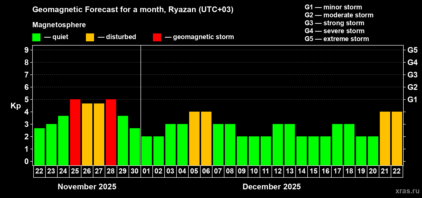 Geomagnetic storm forecast in Ryazan for Nov 22, 2025
