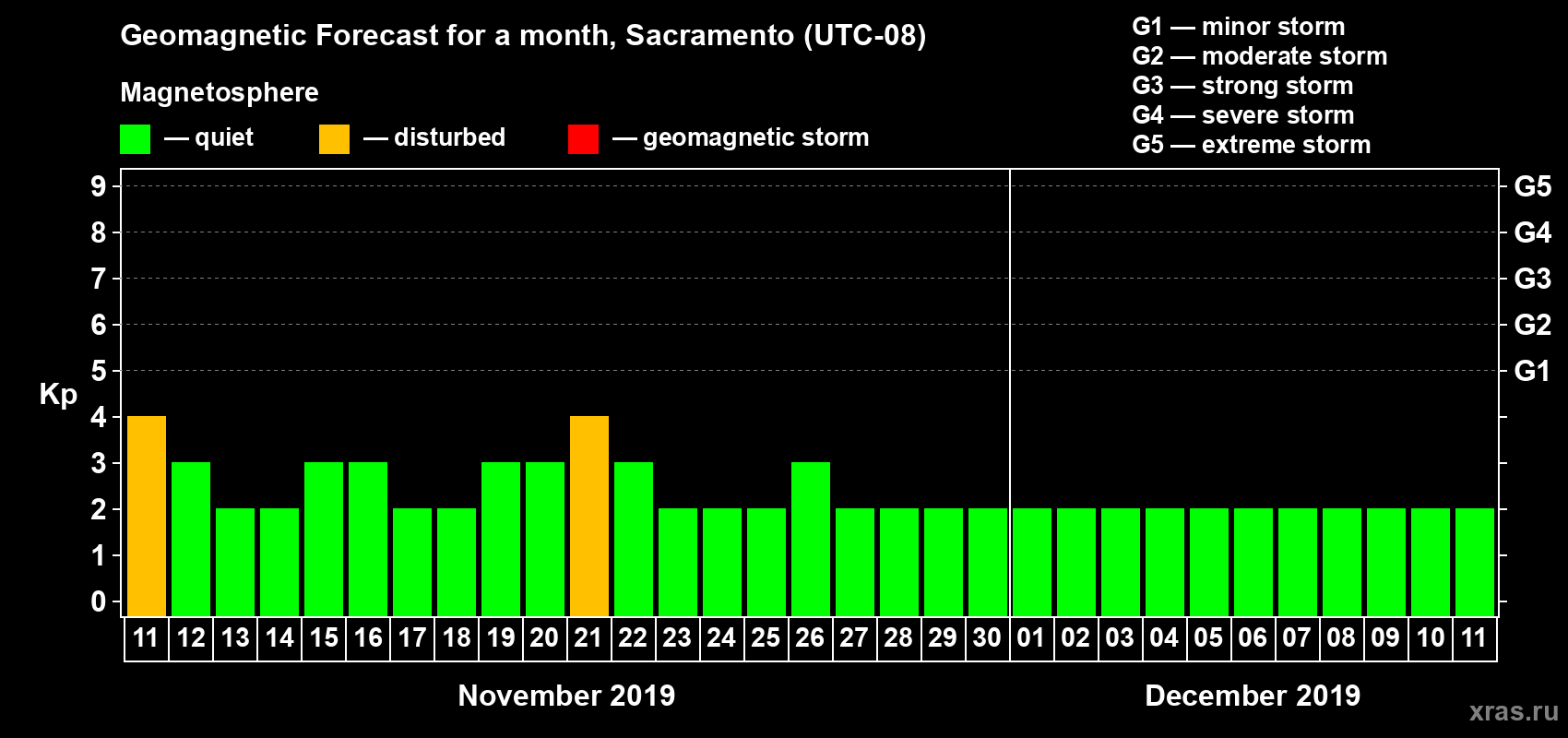 Geomagnetic storm forecast in Sacramento for Nov 11, 2019