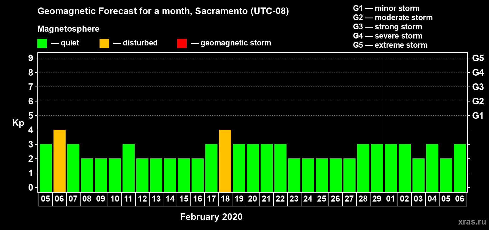 Geomagnetic storm forecast in Sacramento for Feb 05, 2020