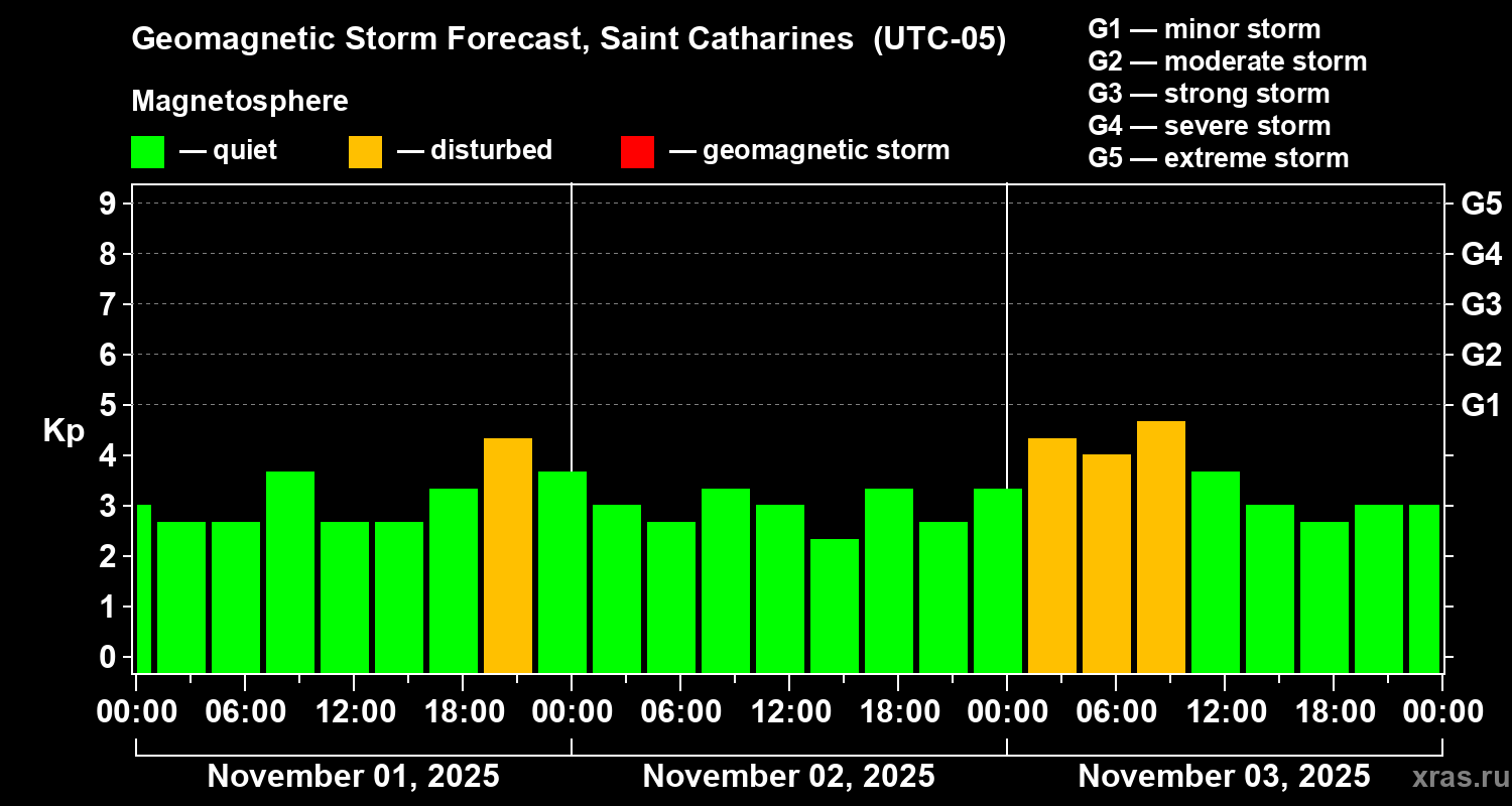 Geomagnetic storm forecast in Saint Catharines for Nov 01, 2025