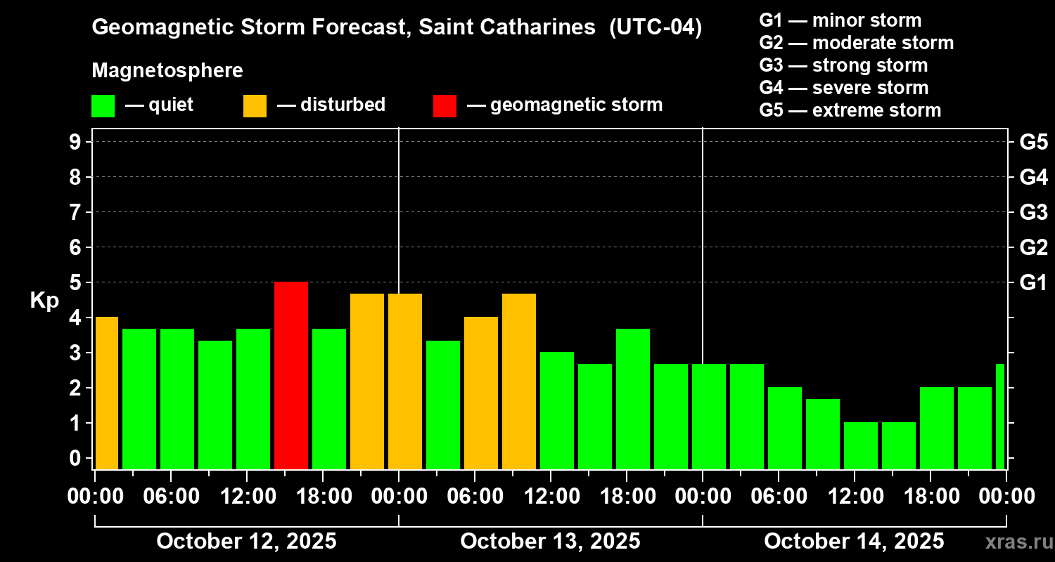 Geomagnetic storm forecast in Saint Catharines for Oct 12, 2025