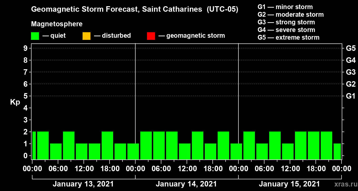 Geomagnetic storm forecast in Saint Catharines for Jan 13, 2021
