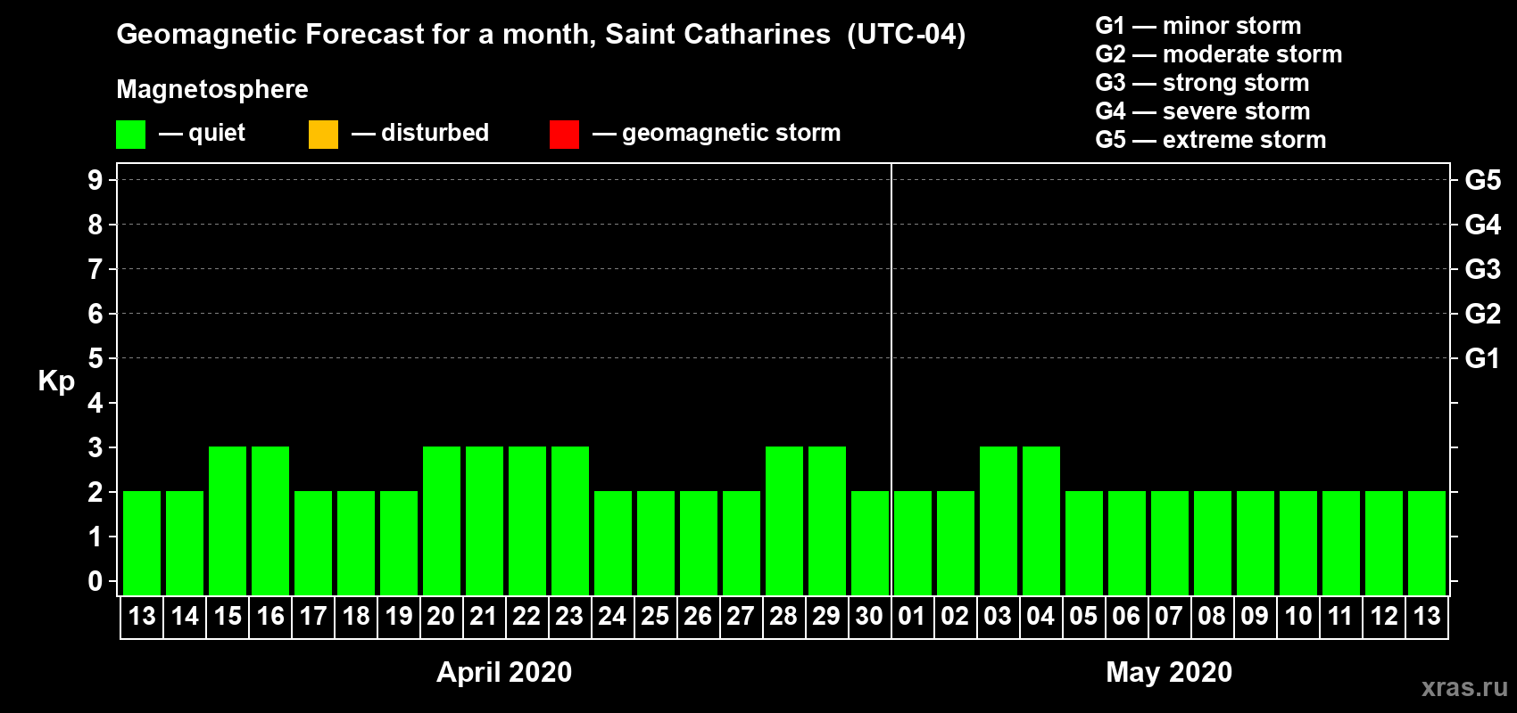 Geomagnetic storm forecast in Saint Catharines for Apr 13, 2020