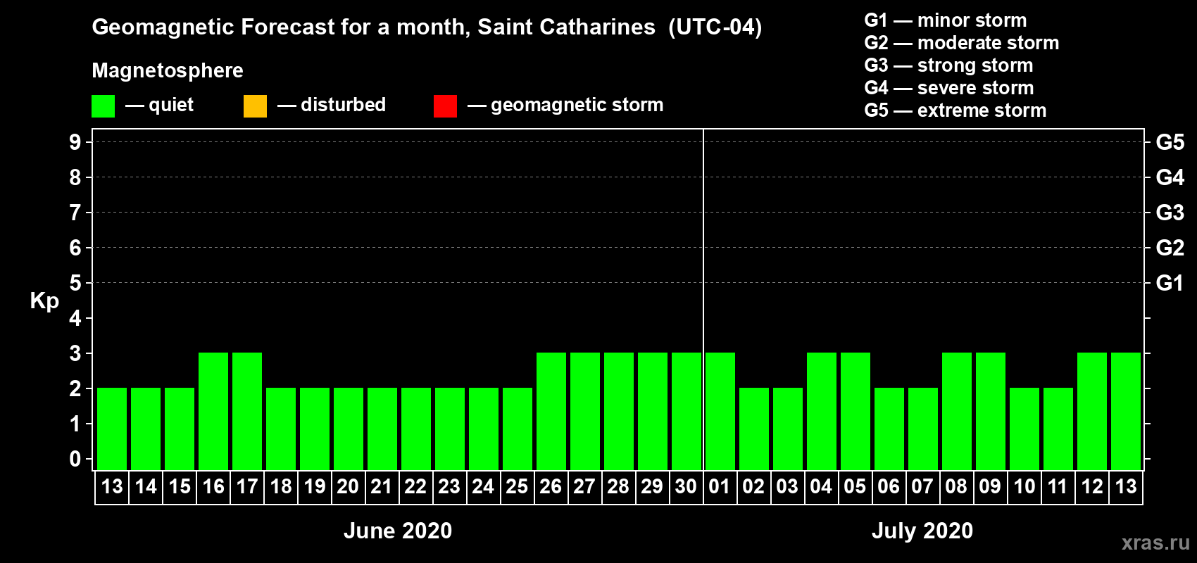 Geomagnetic storm forecast in Saint Catharines for Jun 13, 2020