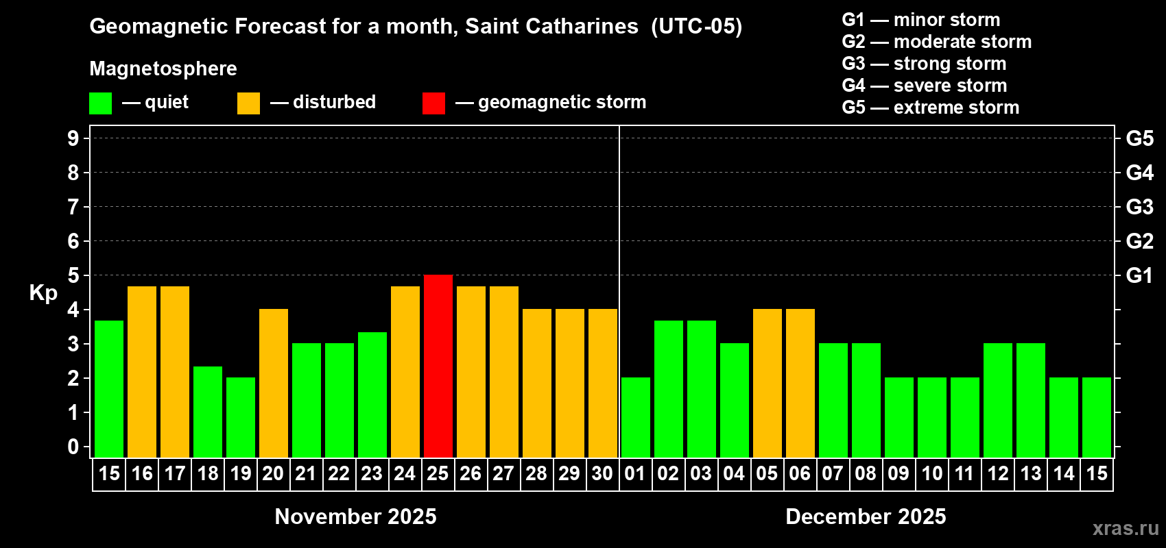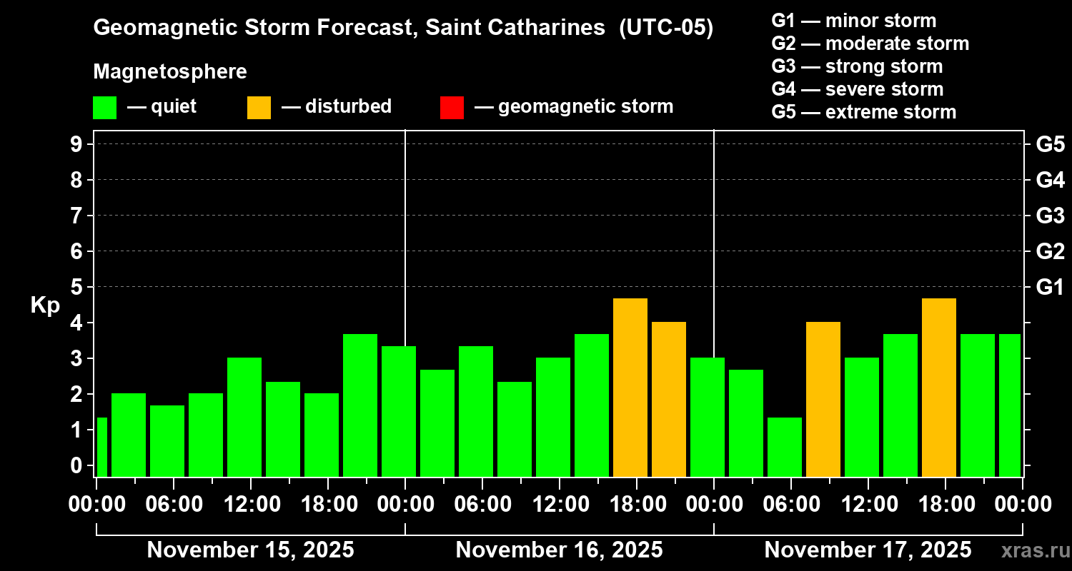 Geomagnetic storm forecast in Saint Catharines for Nov 15, 2025
