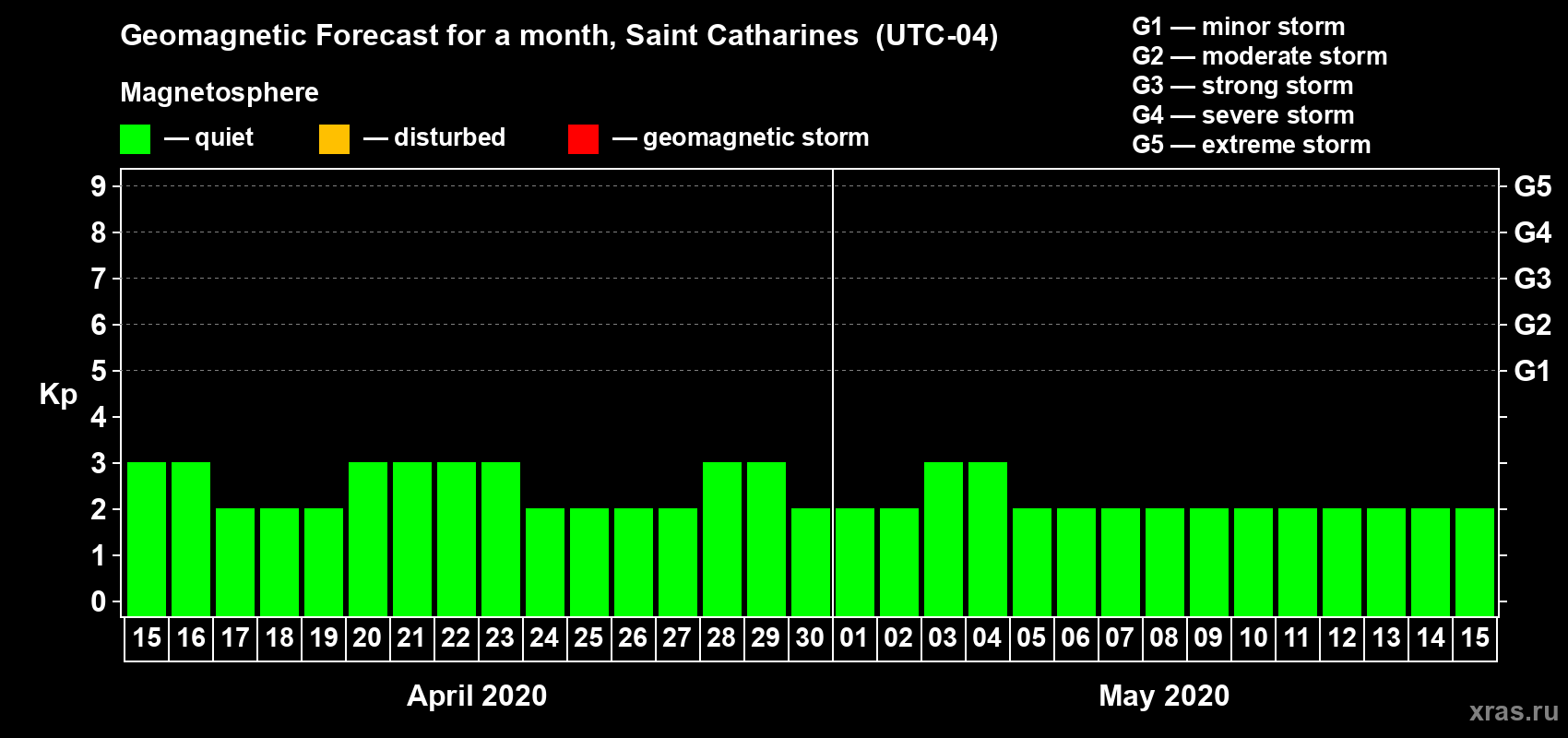 Geomagnetic storm forecast in Saint Catharines for Apr 15, 2020