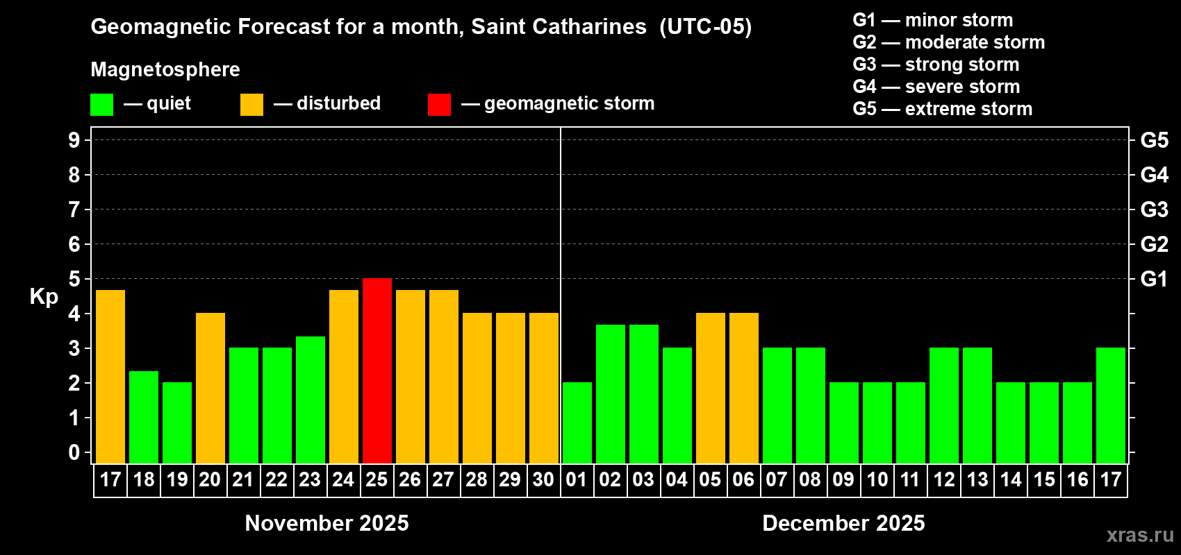 Geomagnetic storm forecast in Saint Catharines for Nov 17, 2025