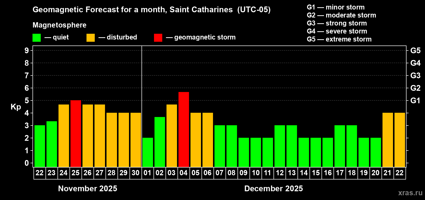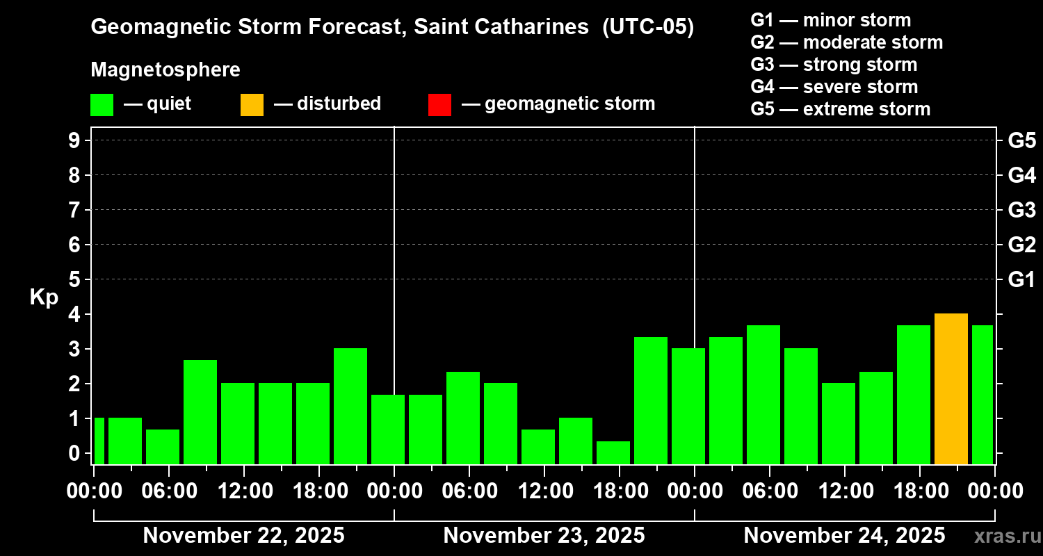 Geomagnetic storm forecast in Saint Catharines for Nov 22, 2025