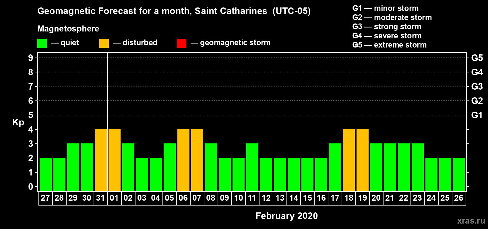 Geomagnetic storm forecast in Saint Catharines for Jan 27, 2020