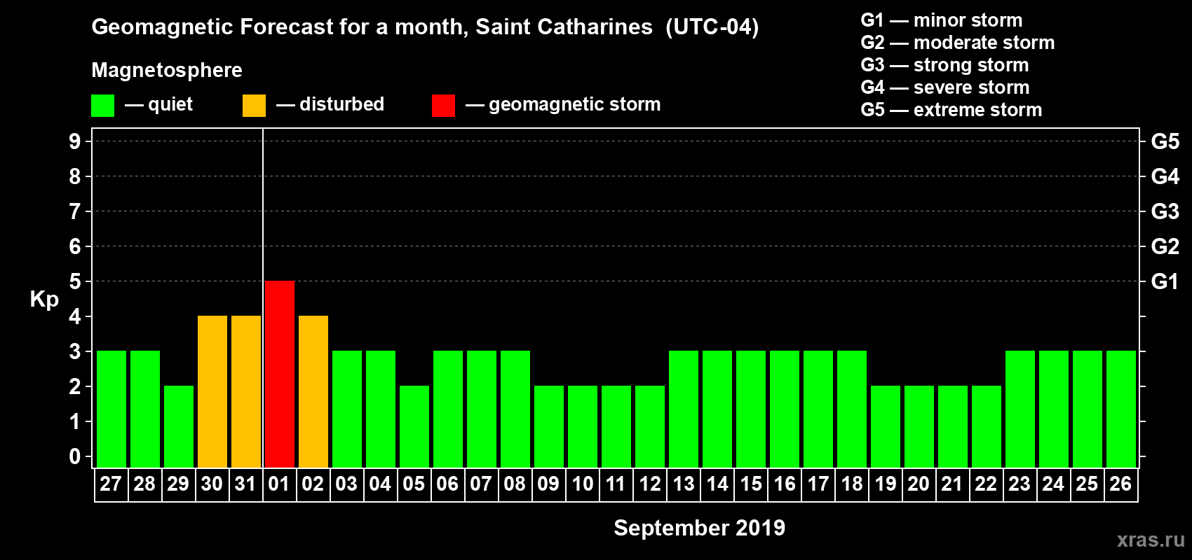 Geomagnetic storm forecast in Saint Catharines for Aug 27, 2019
