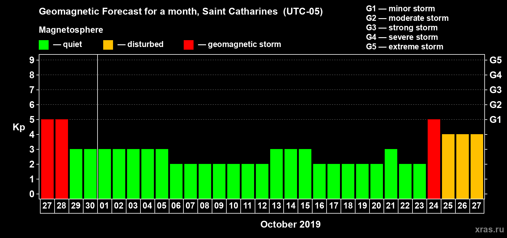 Geomagnetic storm forecast in Saint Catharines for Sep 27, 2019