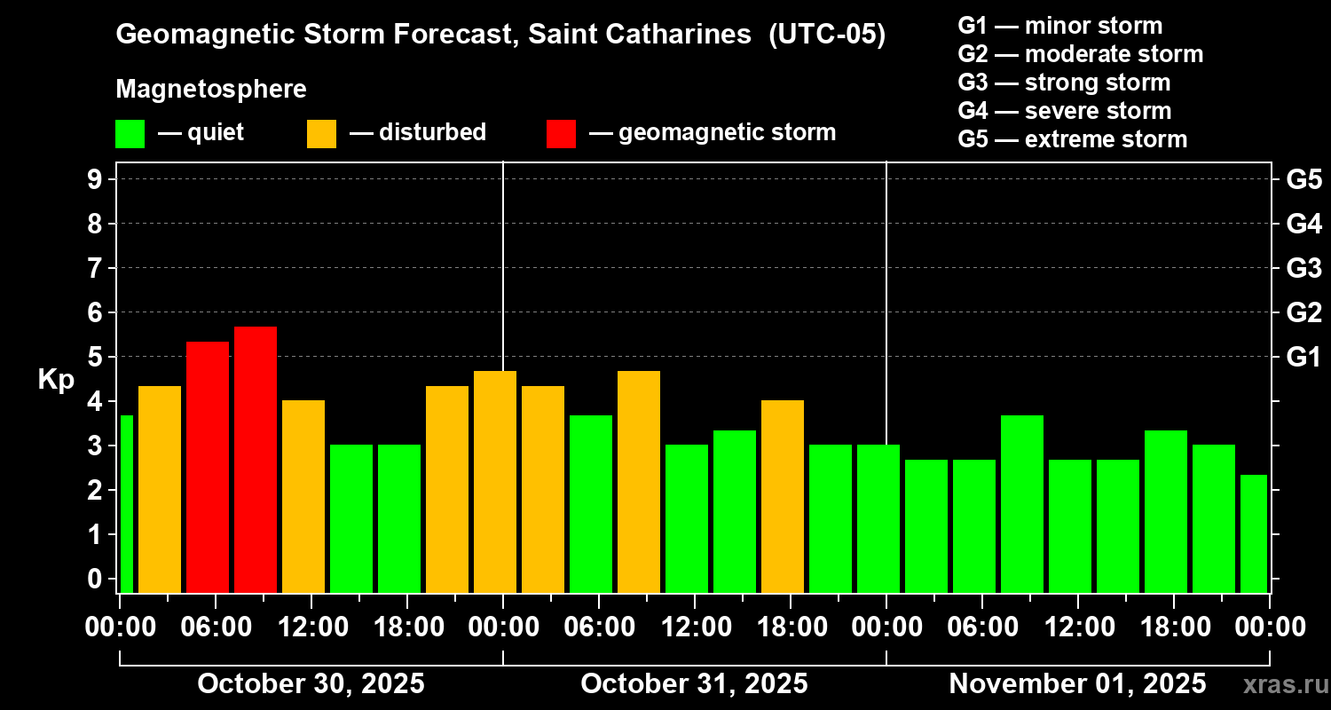 Geomagnetic storm forecast in Saint Catharines for Oct 30, 2025