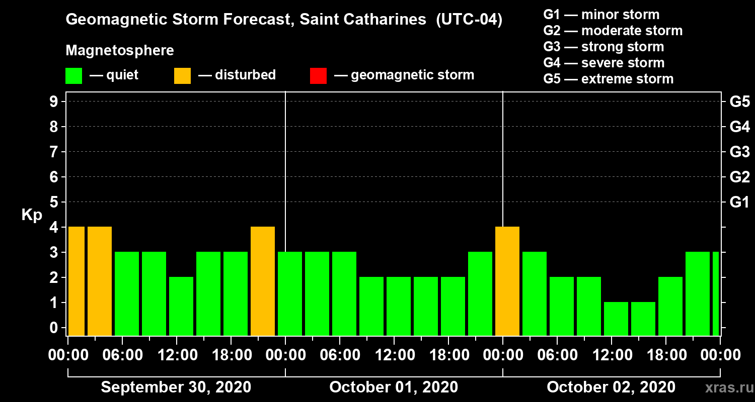 Geomagnetic storm forecast in Saint Catharines for Sep 30, 2020
