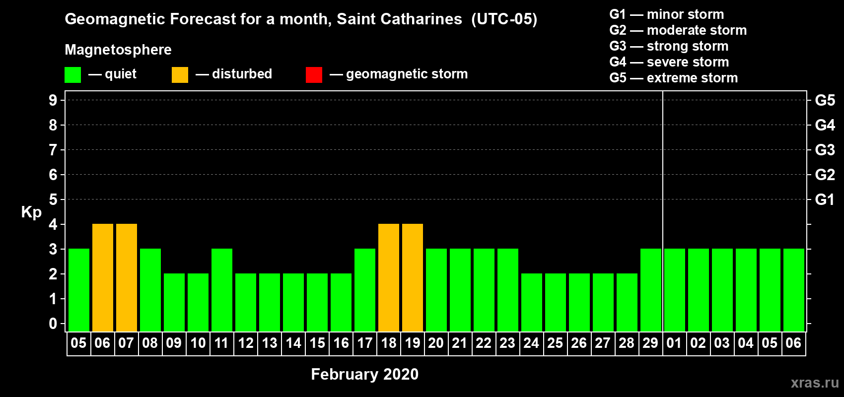 Geomagnetic storm forecast in Saint Catharines for Feb 05, 2020