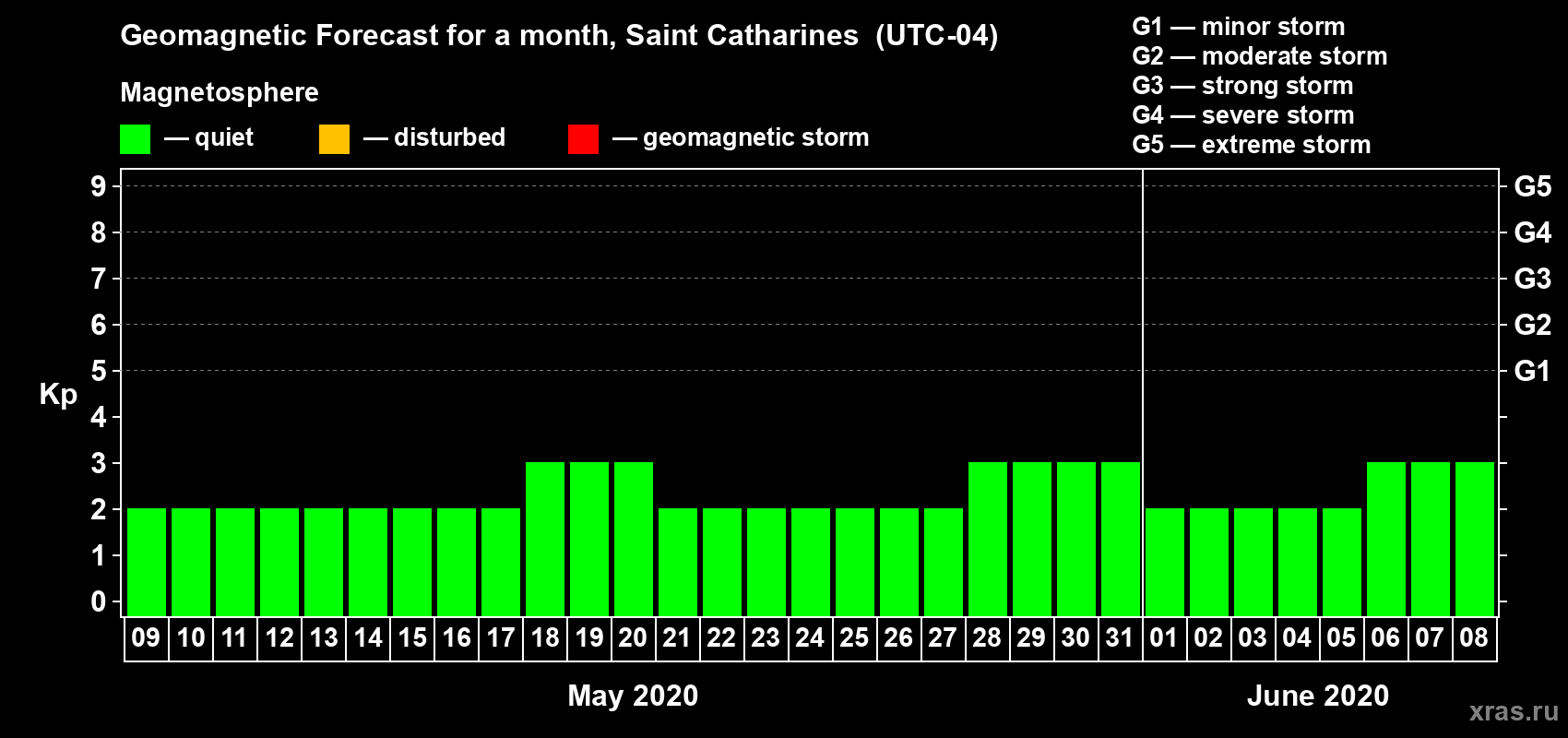 Geomagnetic storm forecast in Saint Catharines for May 09, 2020