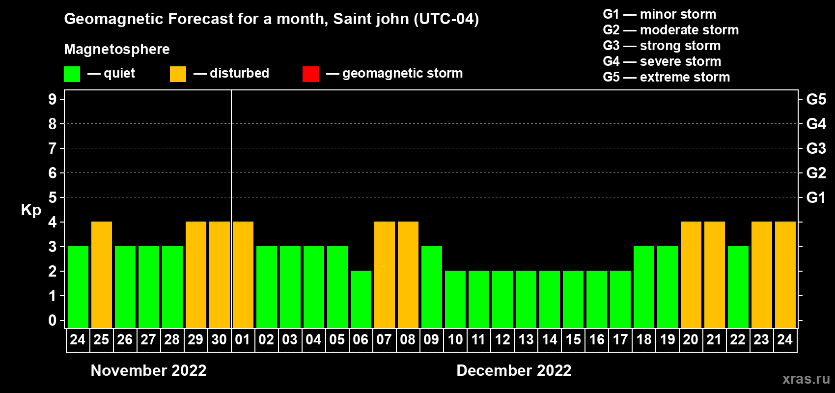 Geomagnetic storm forecast in Saint john for Nov 24, 2022
