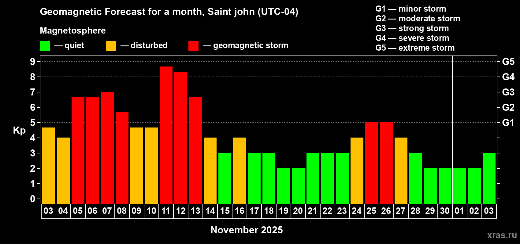 Geomagnetic storm forecast in Saint john for Nov 03, 2025