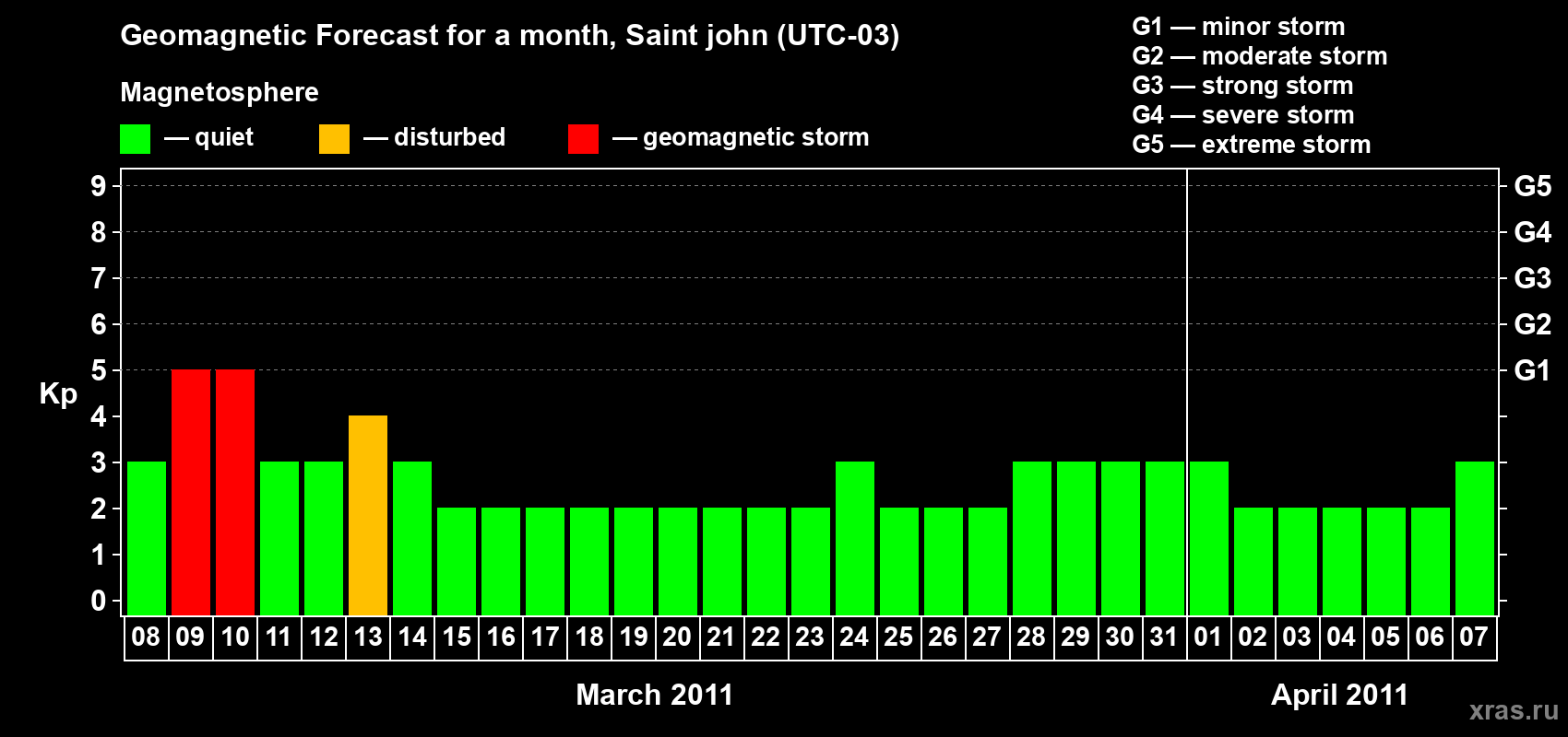 Geomagnetic storm forecast in Saint john for Mar 08, 2011