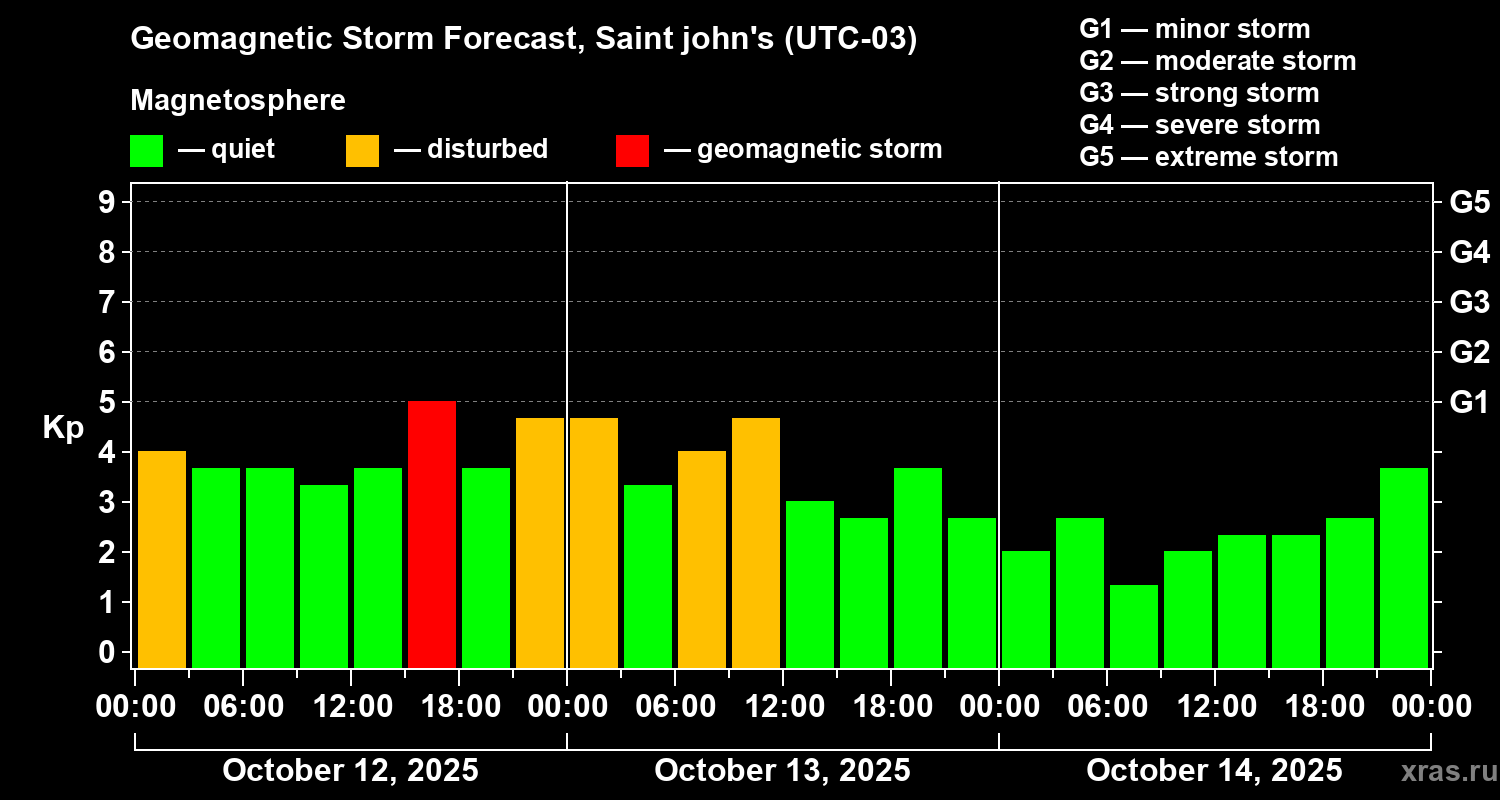 Geomagnetic storm forecast in Saint john's for Oct 12, 2025