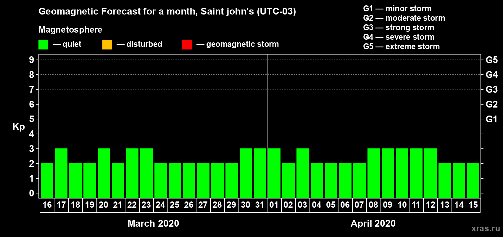 Geomagnetic storm forecast in Saint john's for Mar 16, 2020