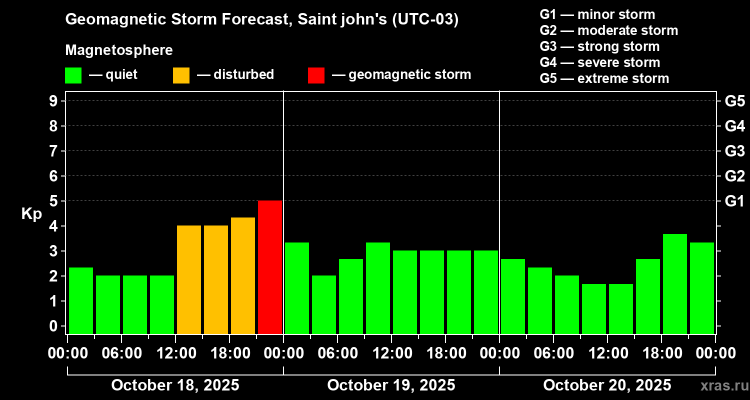 Geomagnetic storm forecast in Saint john's for Oct 18, 2025
