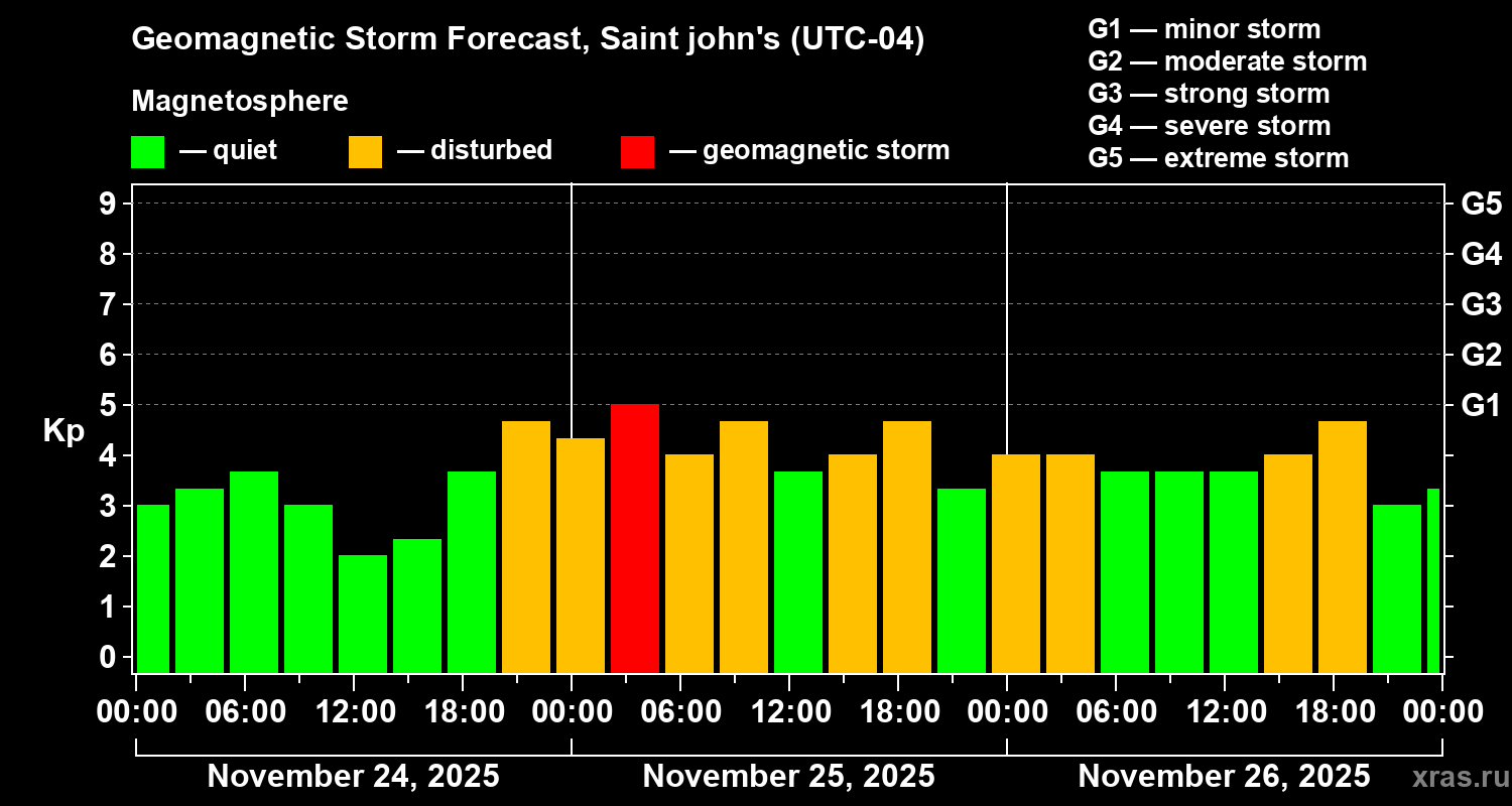 Geomagnetic storm forecast in Saint john's for Nov 24, 2025