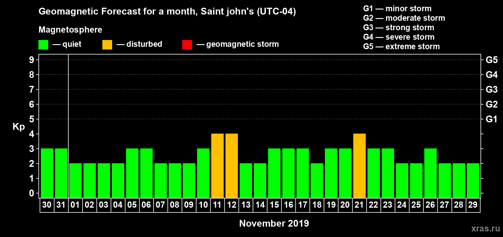 Geomagnetic storm forecast in Saint john's for Oct 30, 2019