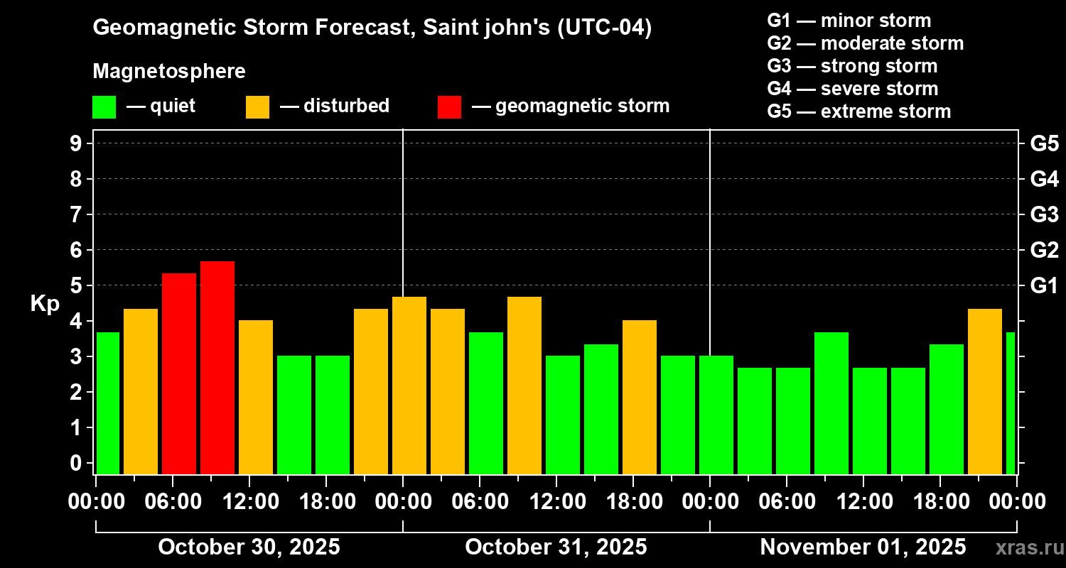 Geomagnetic storm forecast in Saint john's for Oct 30, 2025