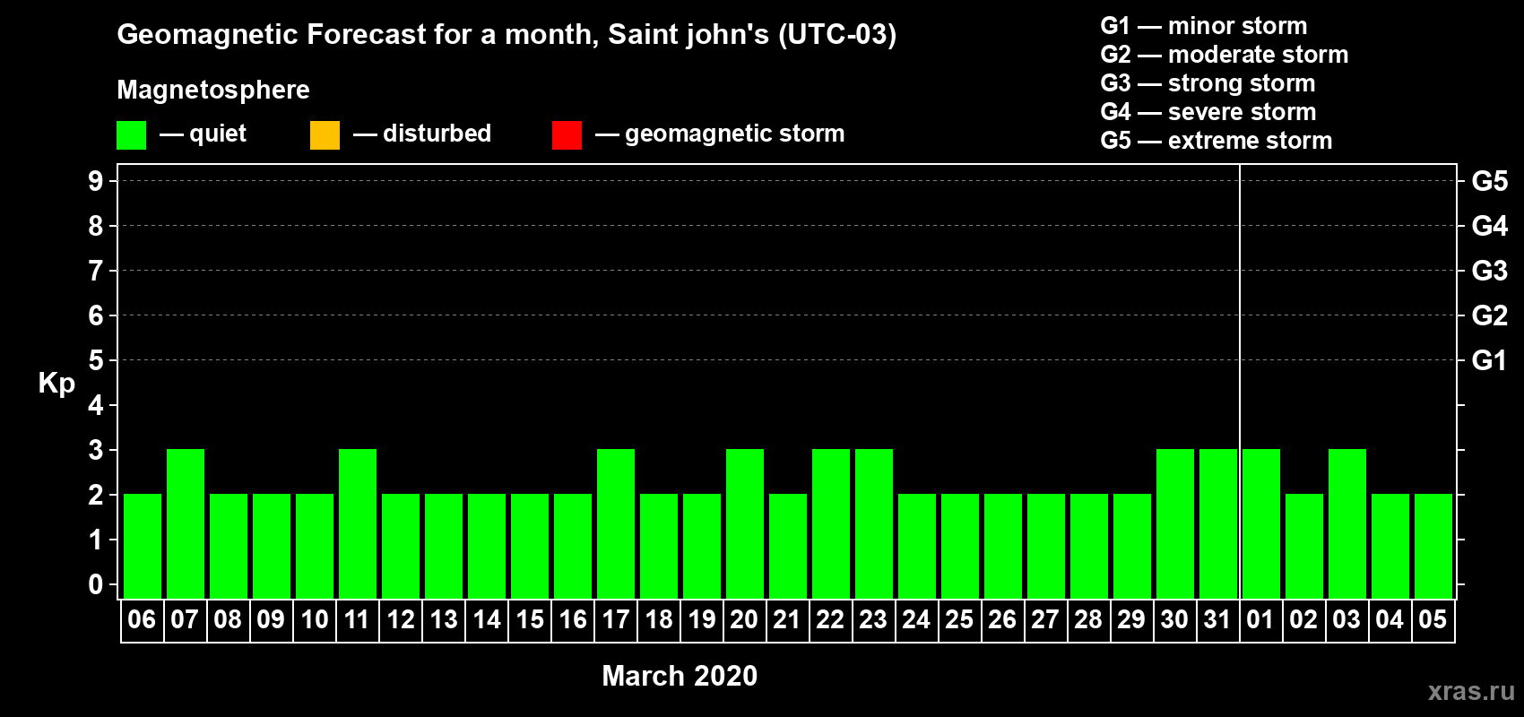Geomagnetic storm forecast in Saint john's for Mar 06, 2020