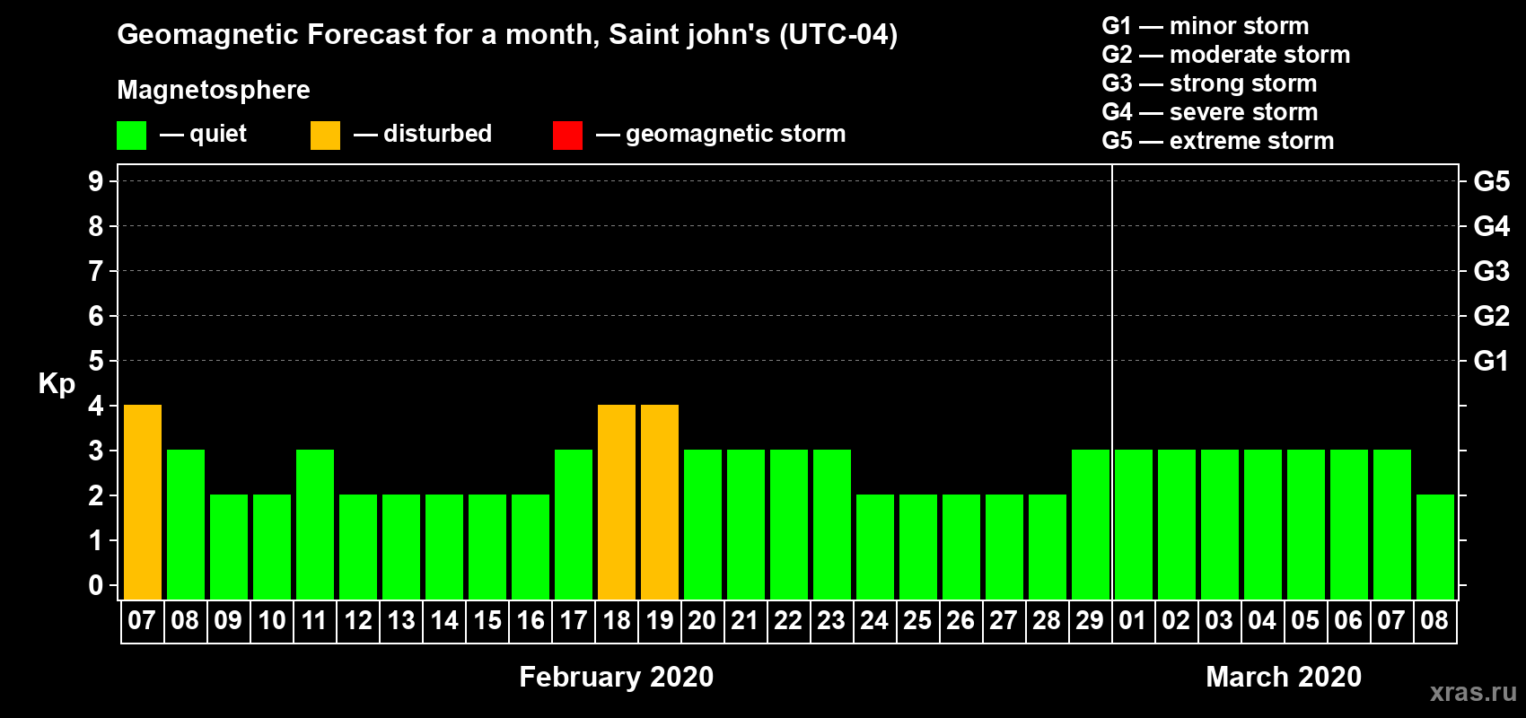 Geomagnetic storm forecast in Saint john's for Feb 07, 2020