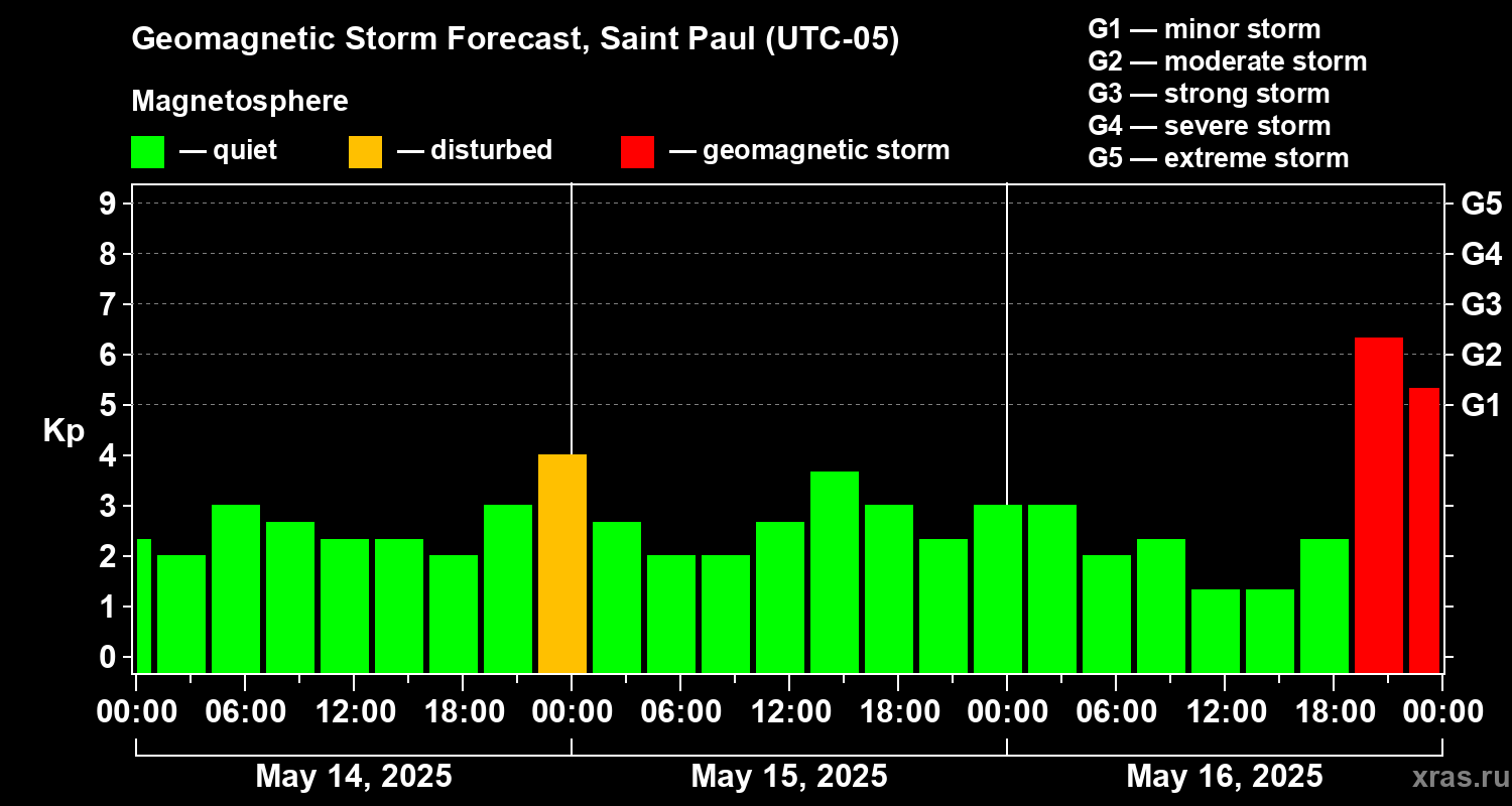 Geomagnetic storm forecast in Saint Paul for May 14, 2025