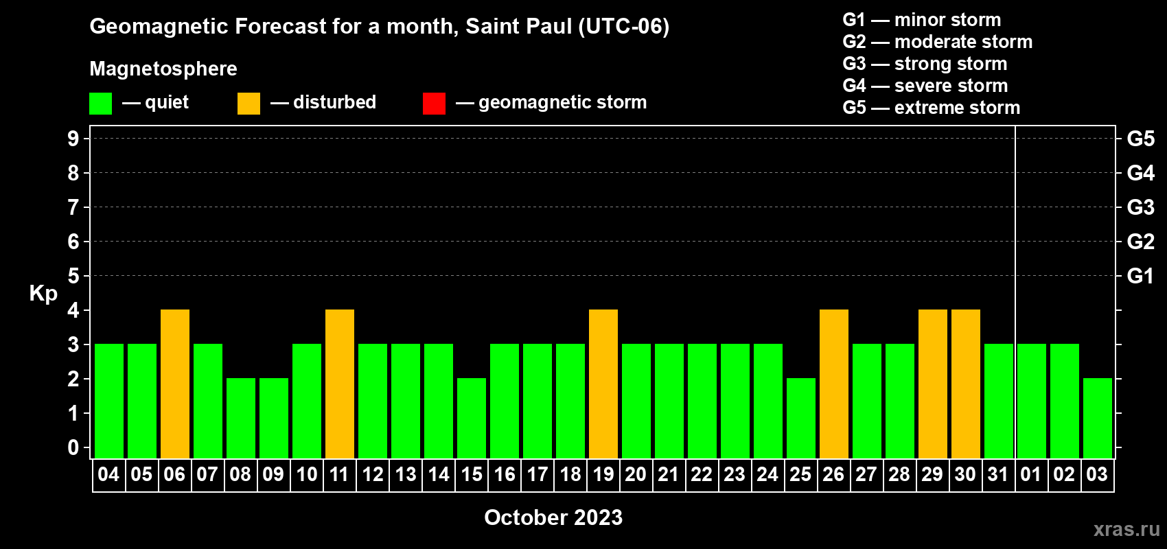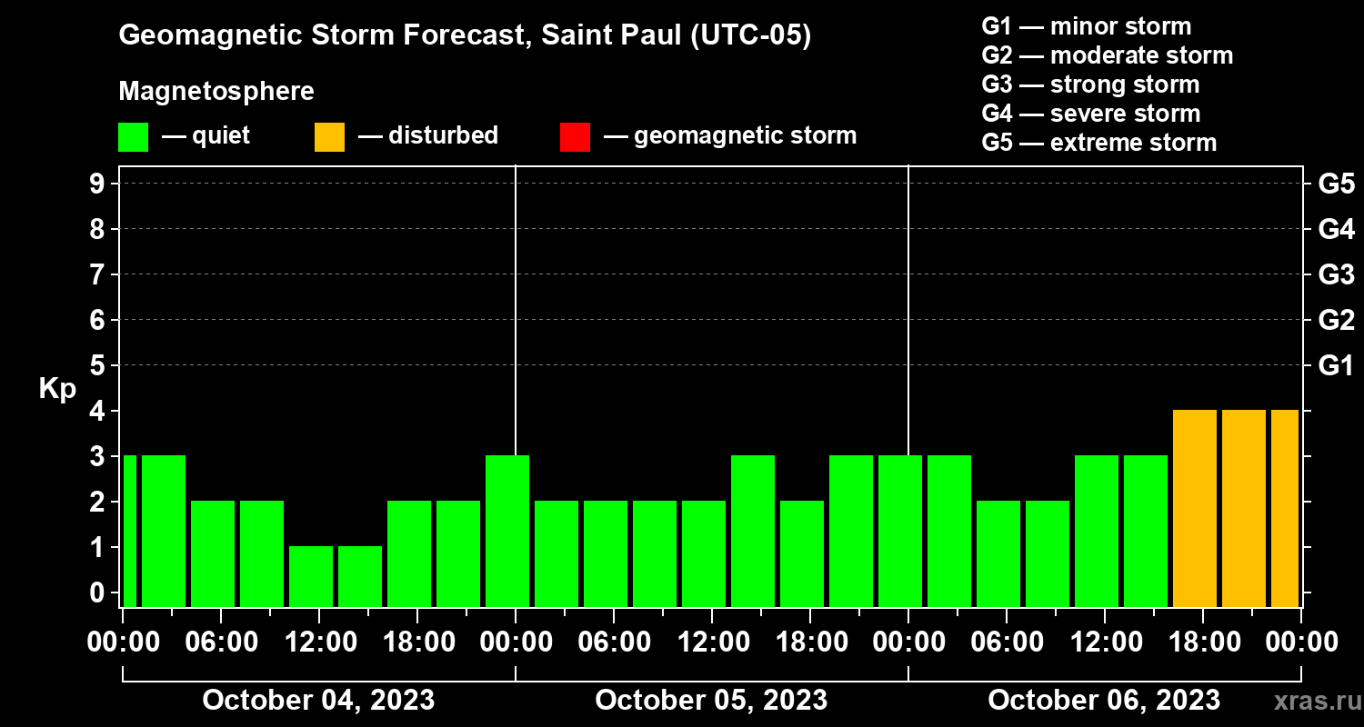 Geomagnetic storm forecast in Saint Paul for Oct 04, 2023