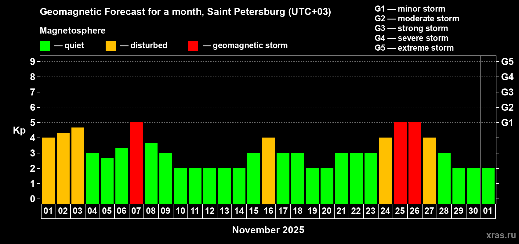 Geomagnetic storm forecast in Saint Petersburg for Nov 01, 2025