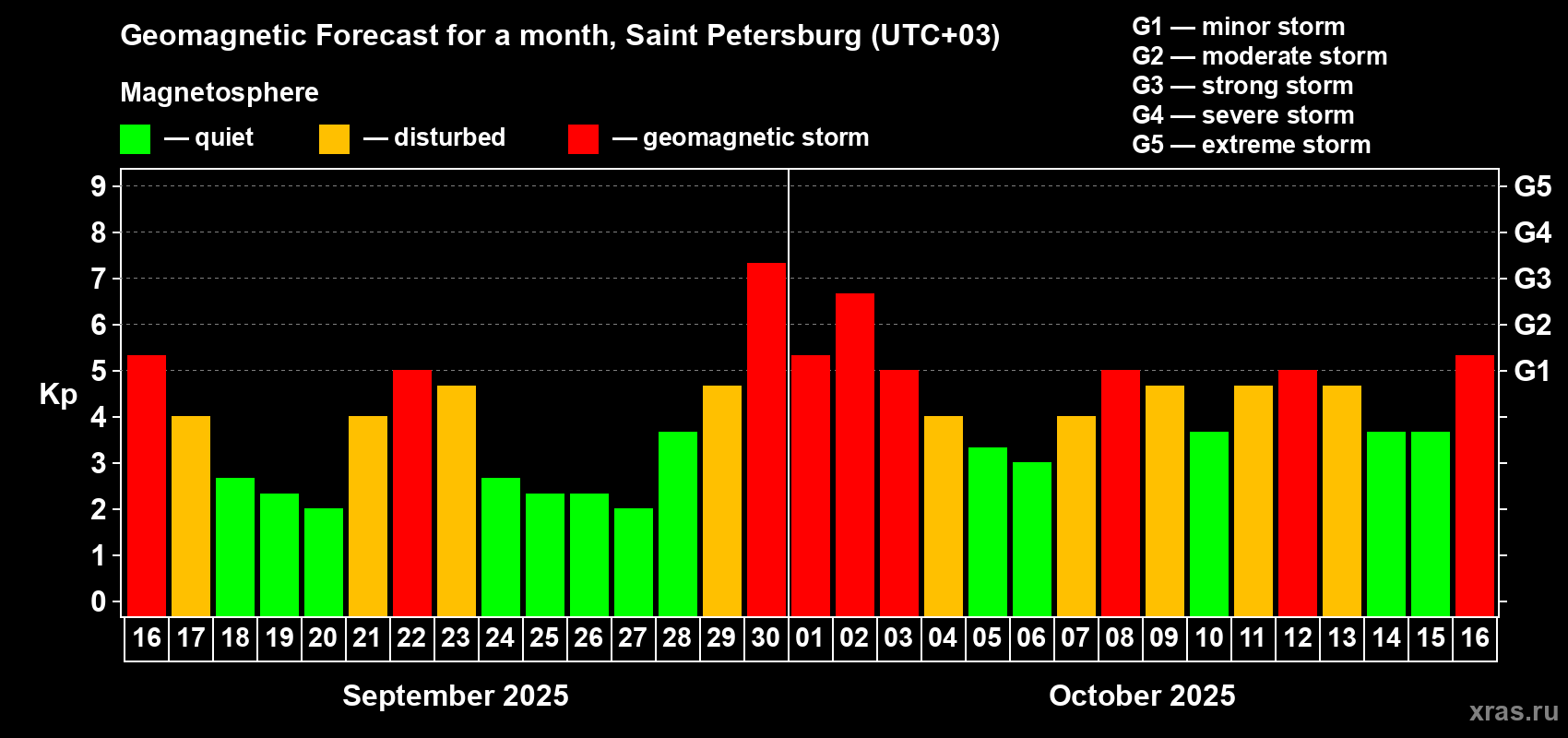 Geomagnetic storm forecast in Saint Petersburg for Sep 16, 2025