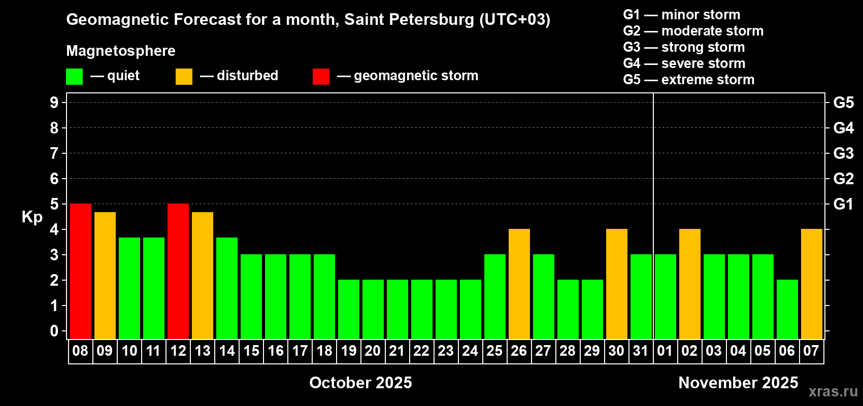 Geomagnetic storm forecast in Saint Petersburg for Oct 08, 2025