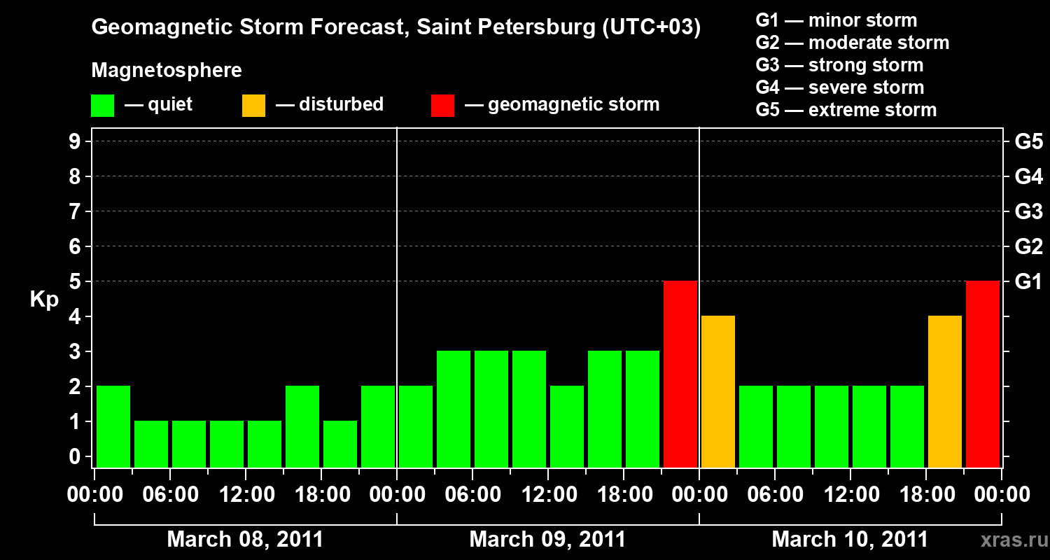 Geomagnetic storm forecast in Saint Petersburg for Mar 08, 2011