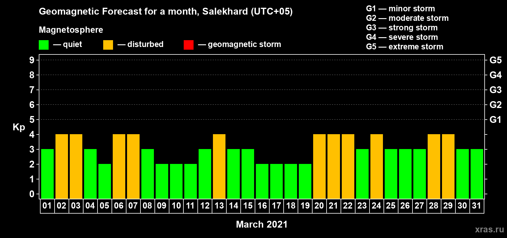 Geomagnetic storm forecast in Salekhard for Mar 01, 2021