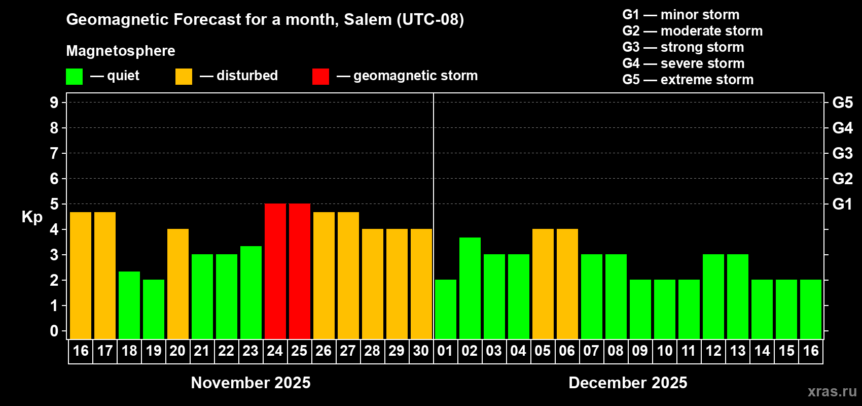 Geomagnetic storm forecast in Salem for Nov 16, 2025