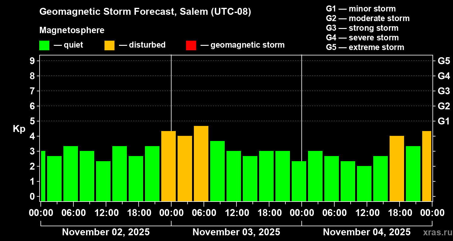 Geomagnetic storm forecast in Salem for Nov 02, 2025