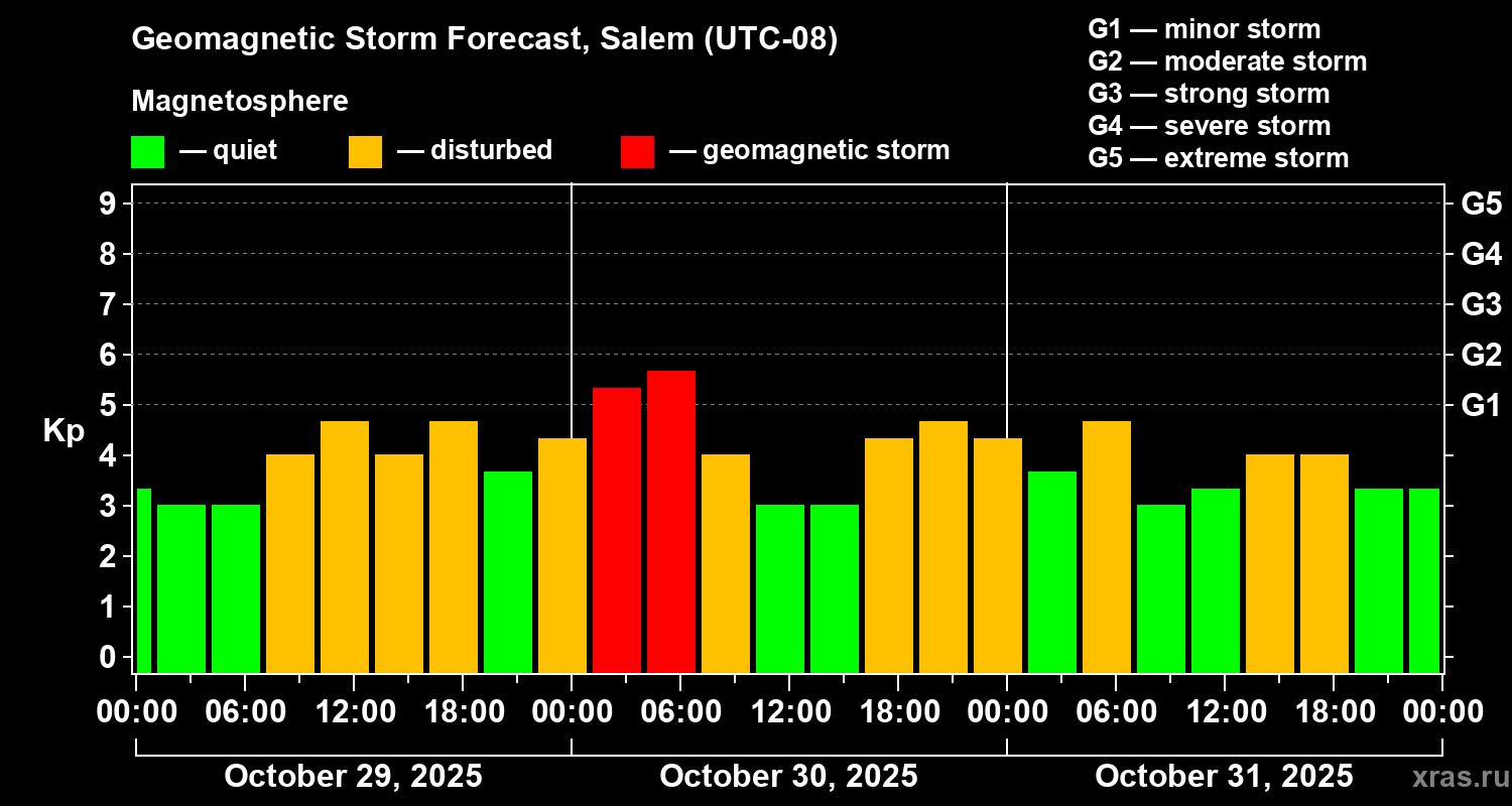 Geomagnetic storm forecast in Salem for Oct 29, 2025