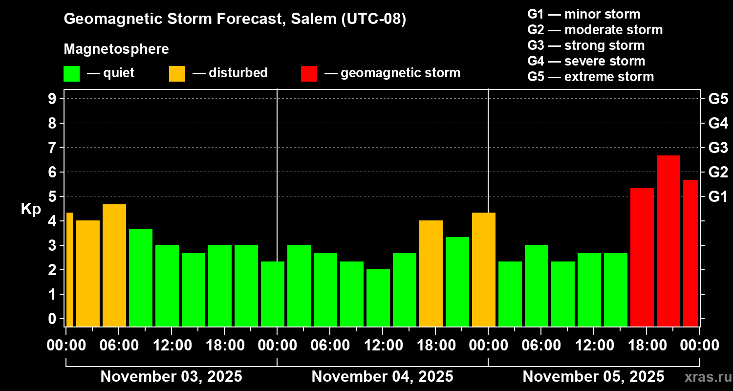 Geomagnetic storm forecast in Salem for Nov 03, 2025