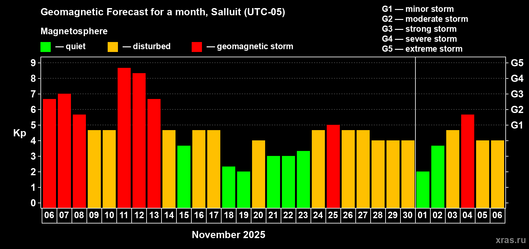 Geomagnetic storm forecast in Salluit for Nov 06, 2025