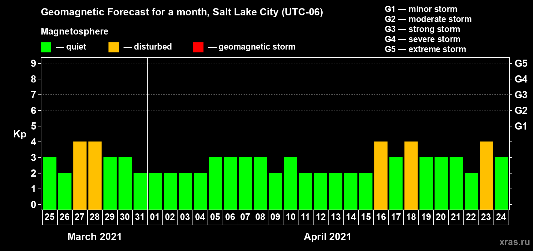 Geomagnetic storm forecast in Salt Lake City for Mar 25, 2021