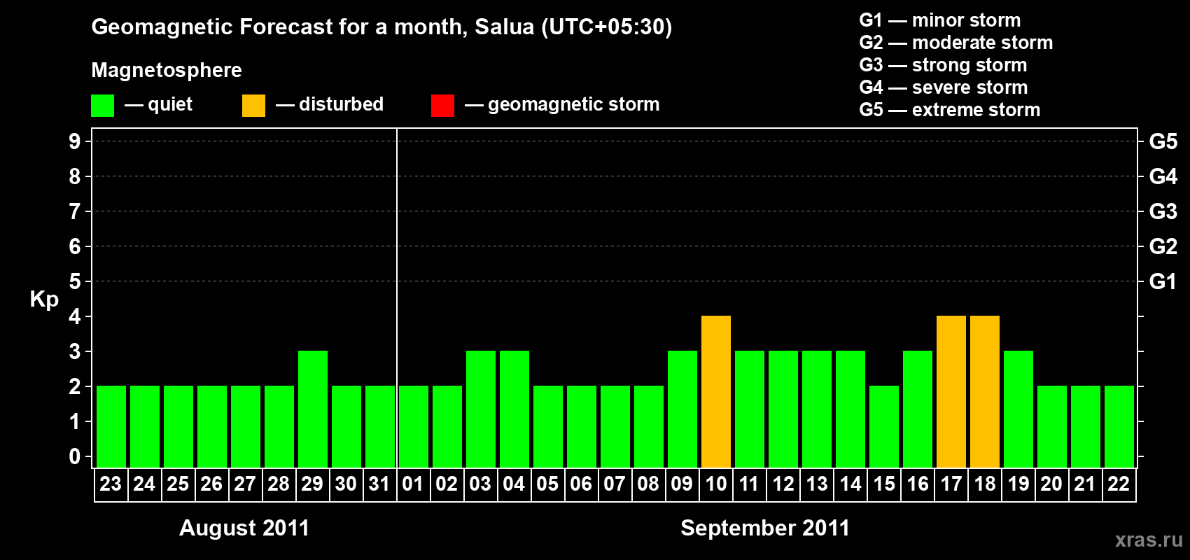Geomagnetic storm forecast in Salua for Aug 23, 2011