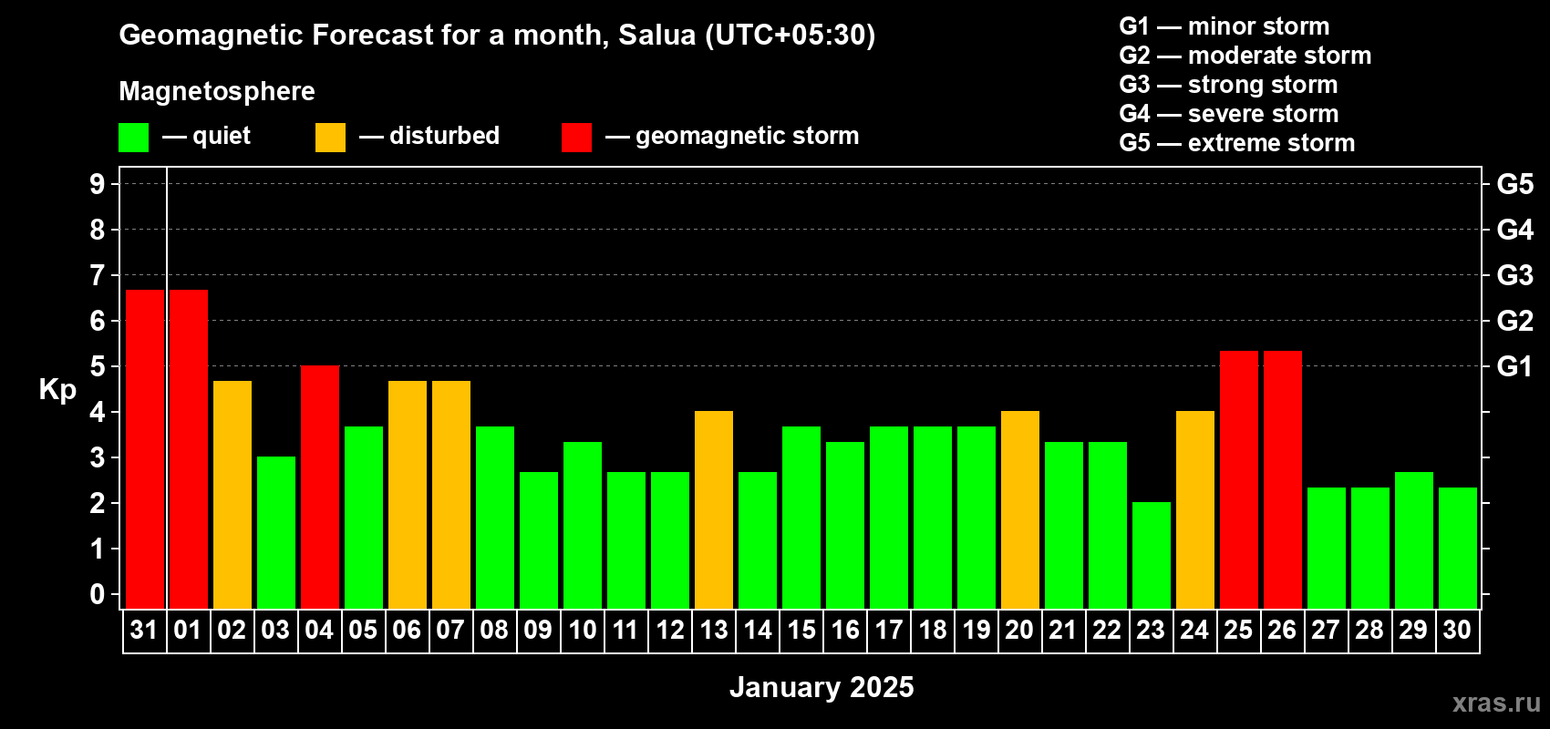 Geomagnetic storm forecast in Salua for Dec 31, 2024