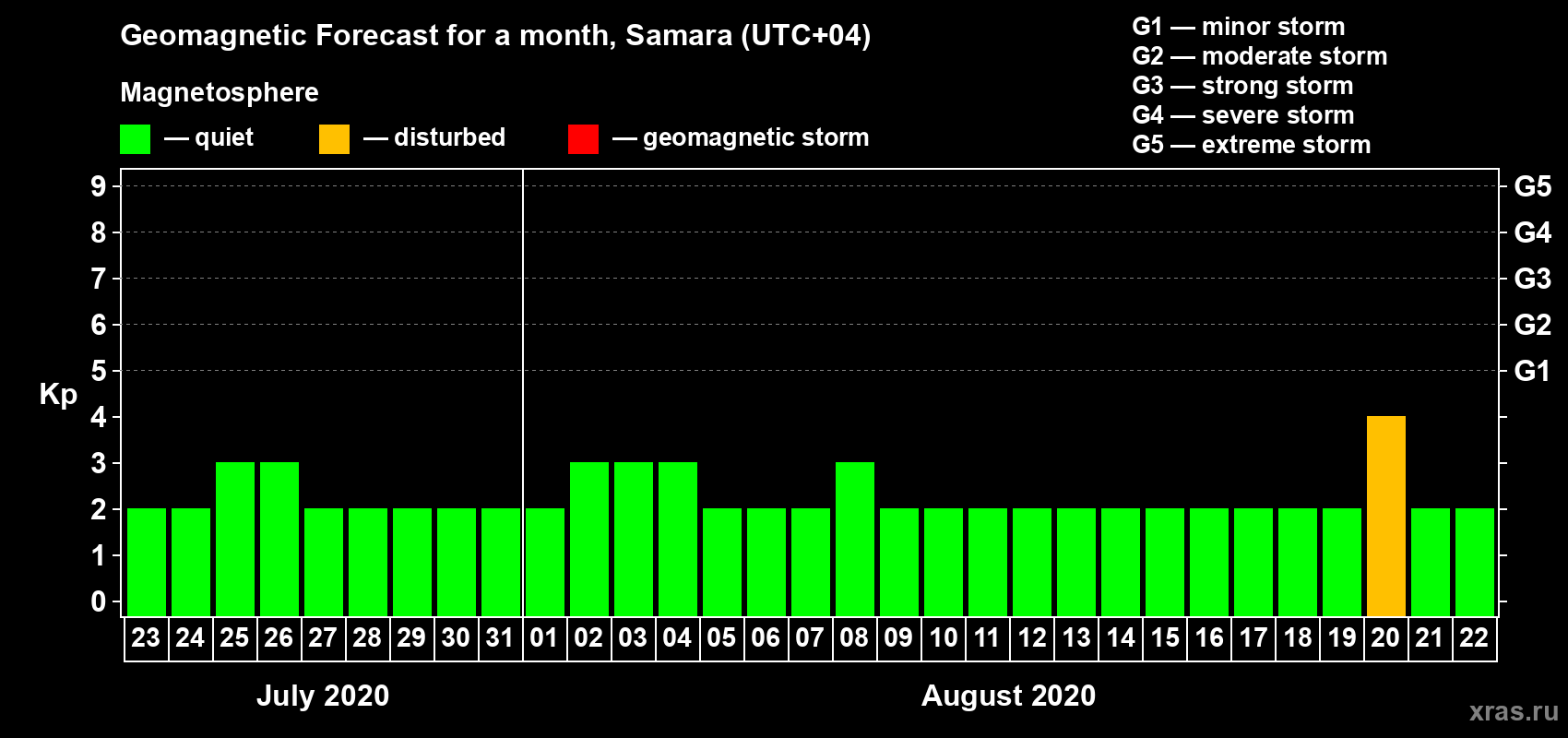 Geomagnetic storm forecast in Samara for Jul 23, 2020